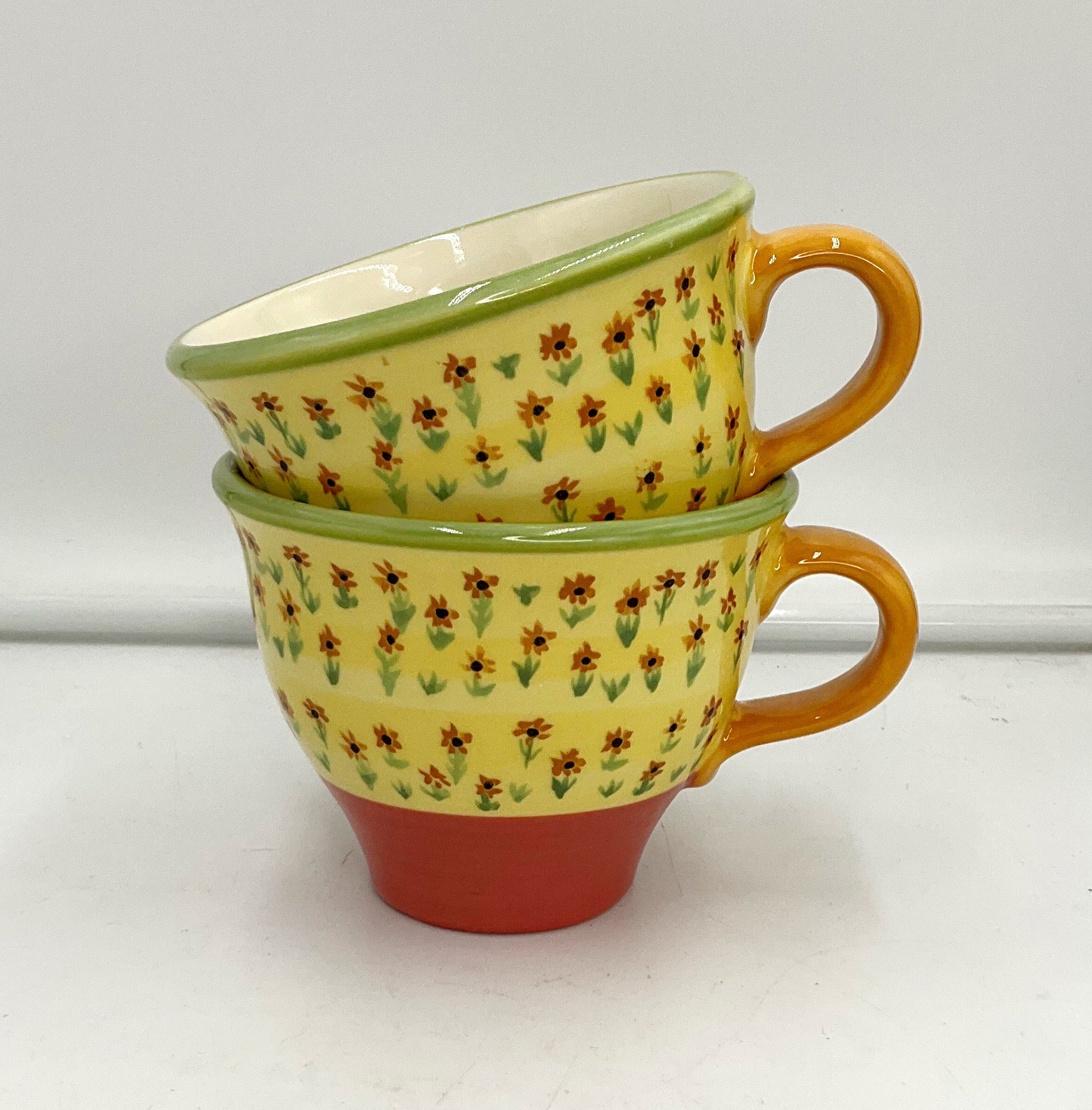 A pair of stoneware Pistoulet latte mugs by Phaltzgraff, with sunflowers
