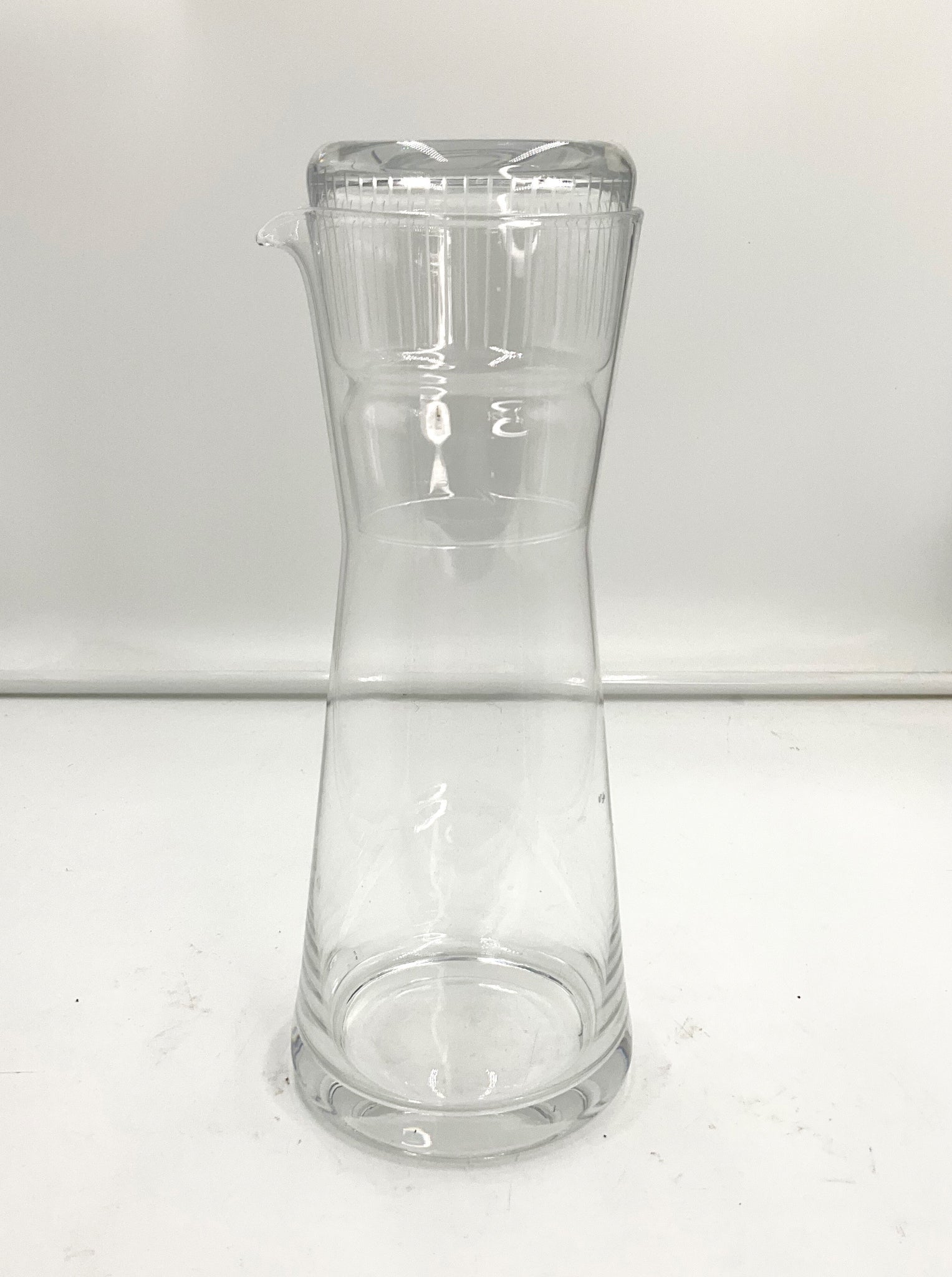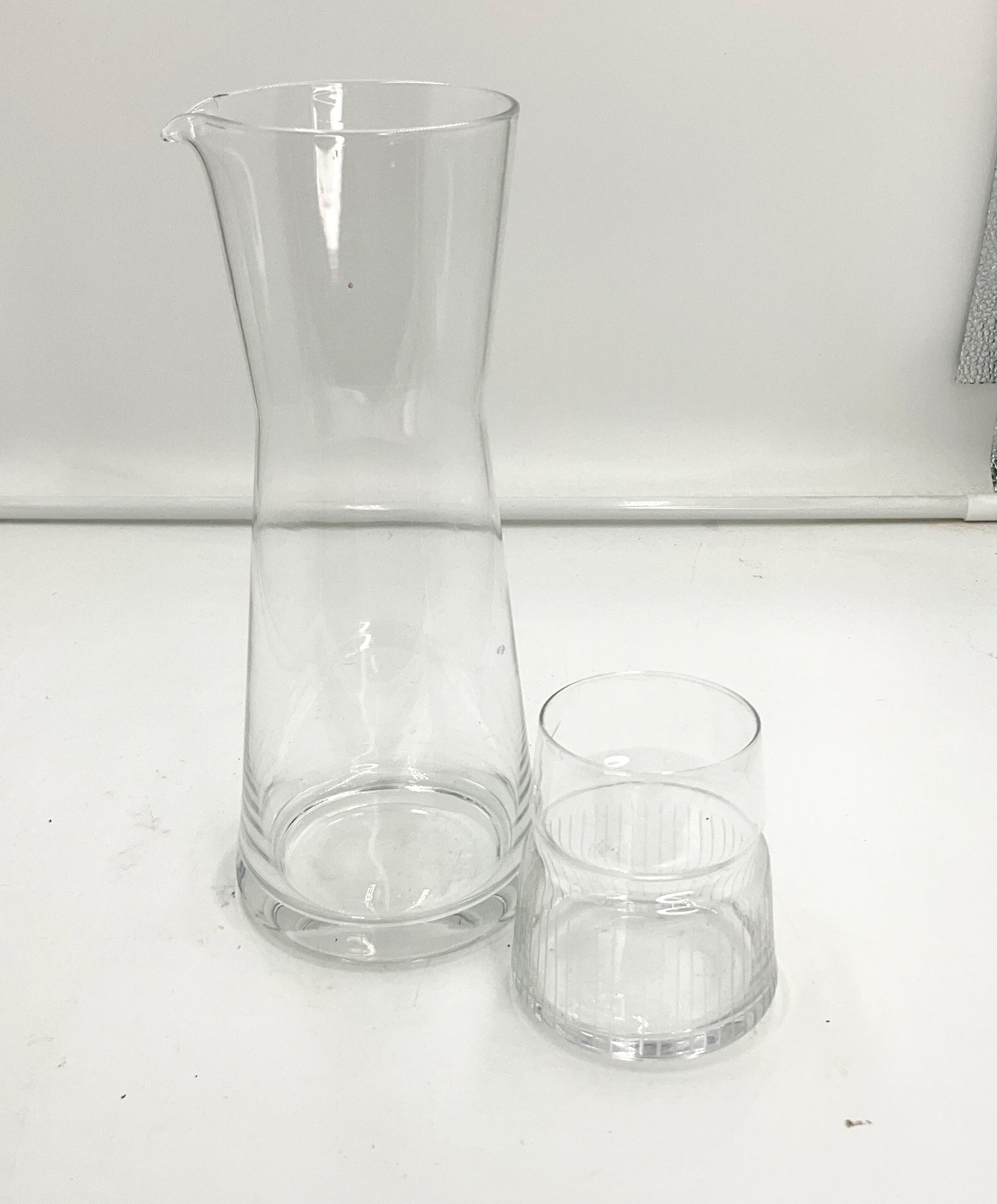 A tall glass tumbler up… a glass carafe with lid that doubles as a cup. Note that there is a small chip on the rim of the carafe