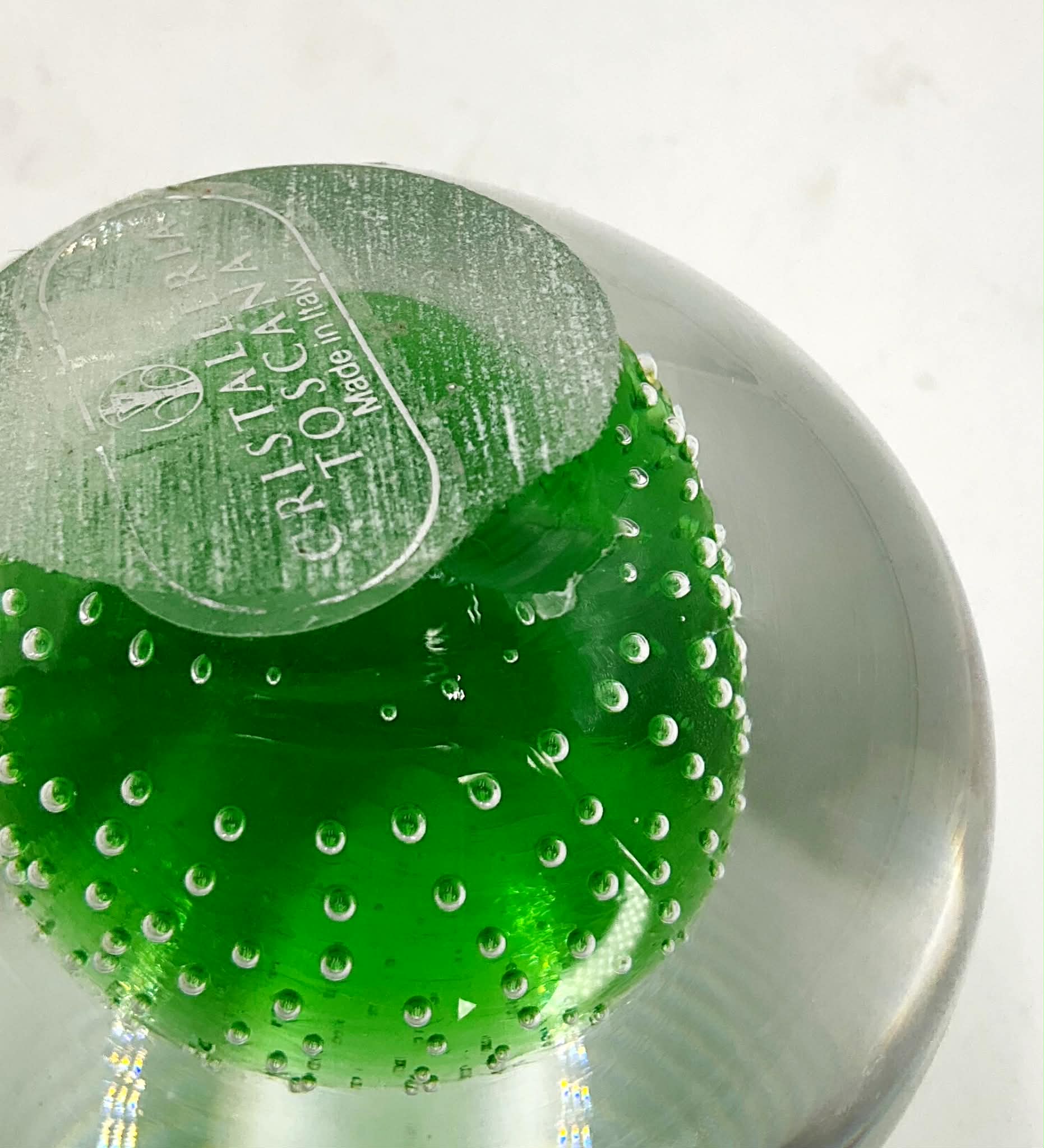 A green Bullicante glass paperweight from Crystalleria Toscana, Italy.  Note the pic showing the chip at the base.
