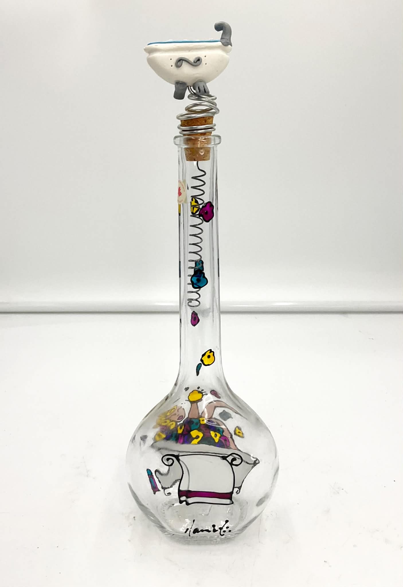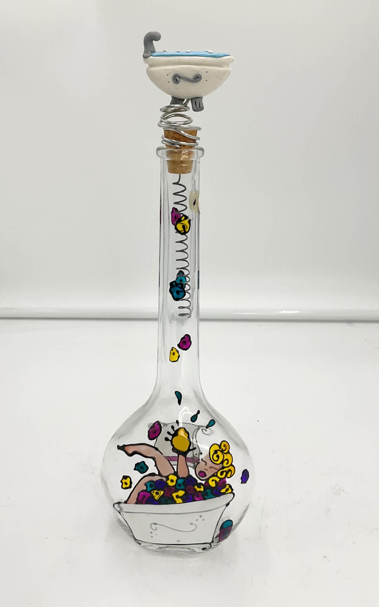 A signed hand painted bottle, with a woman taking a bubble bath, with a bathtub stopper.