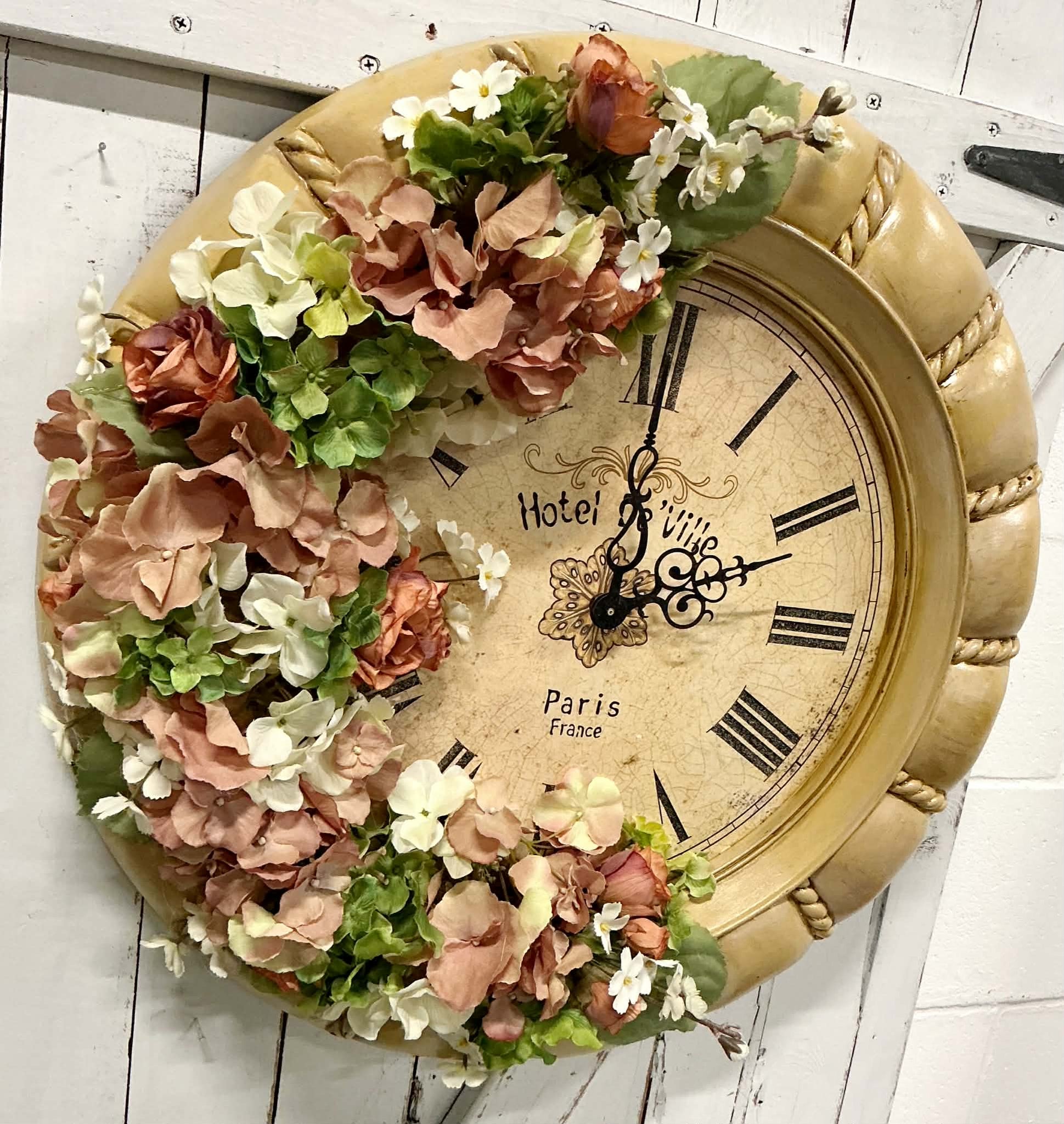 A large metal clock face, painted and aged with vintage toned florals