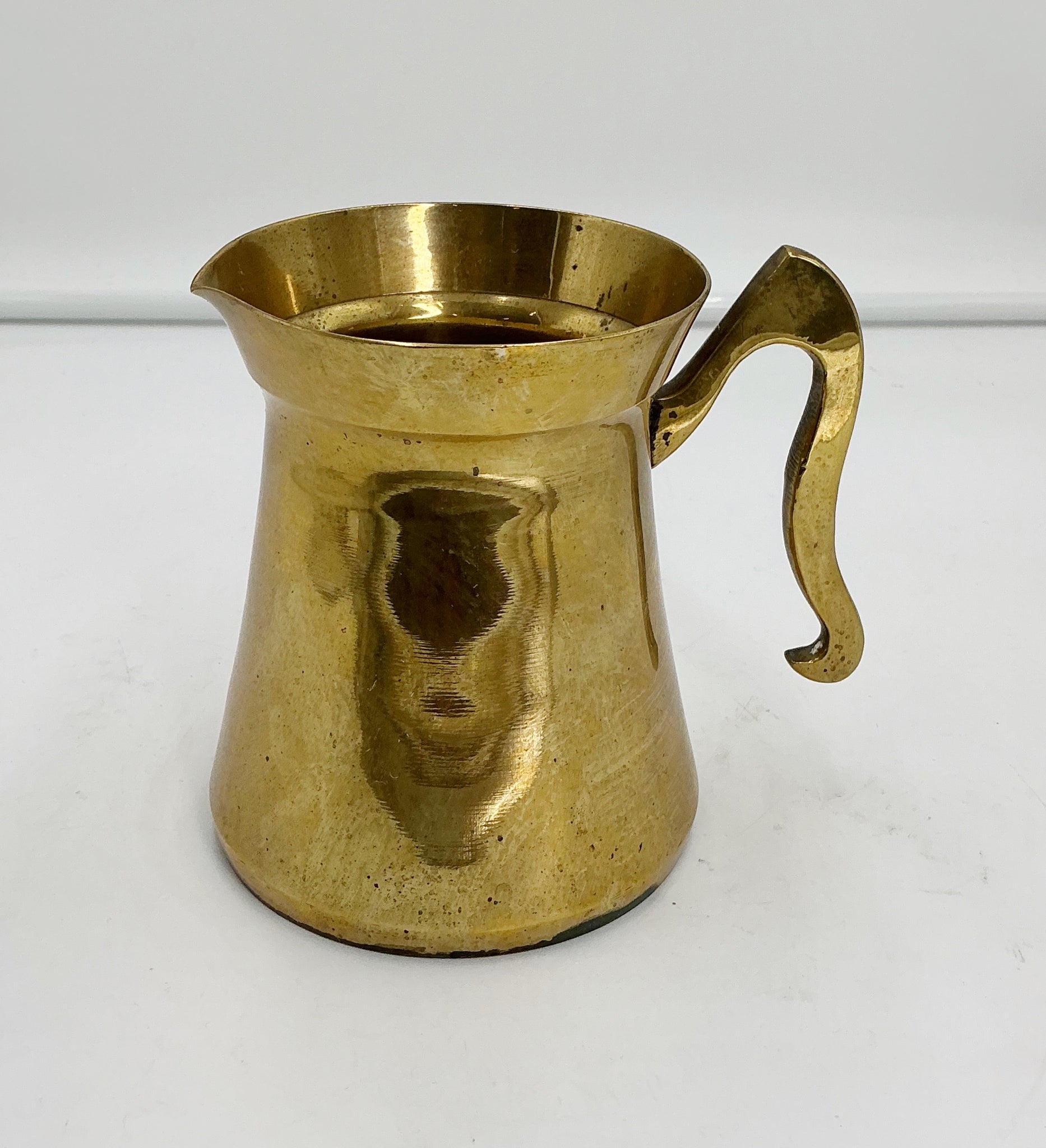 A midcentury Brutalist design solid brass pitcher from India