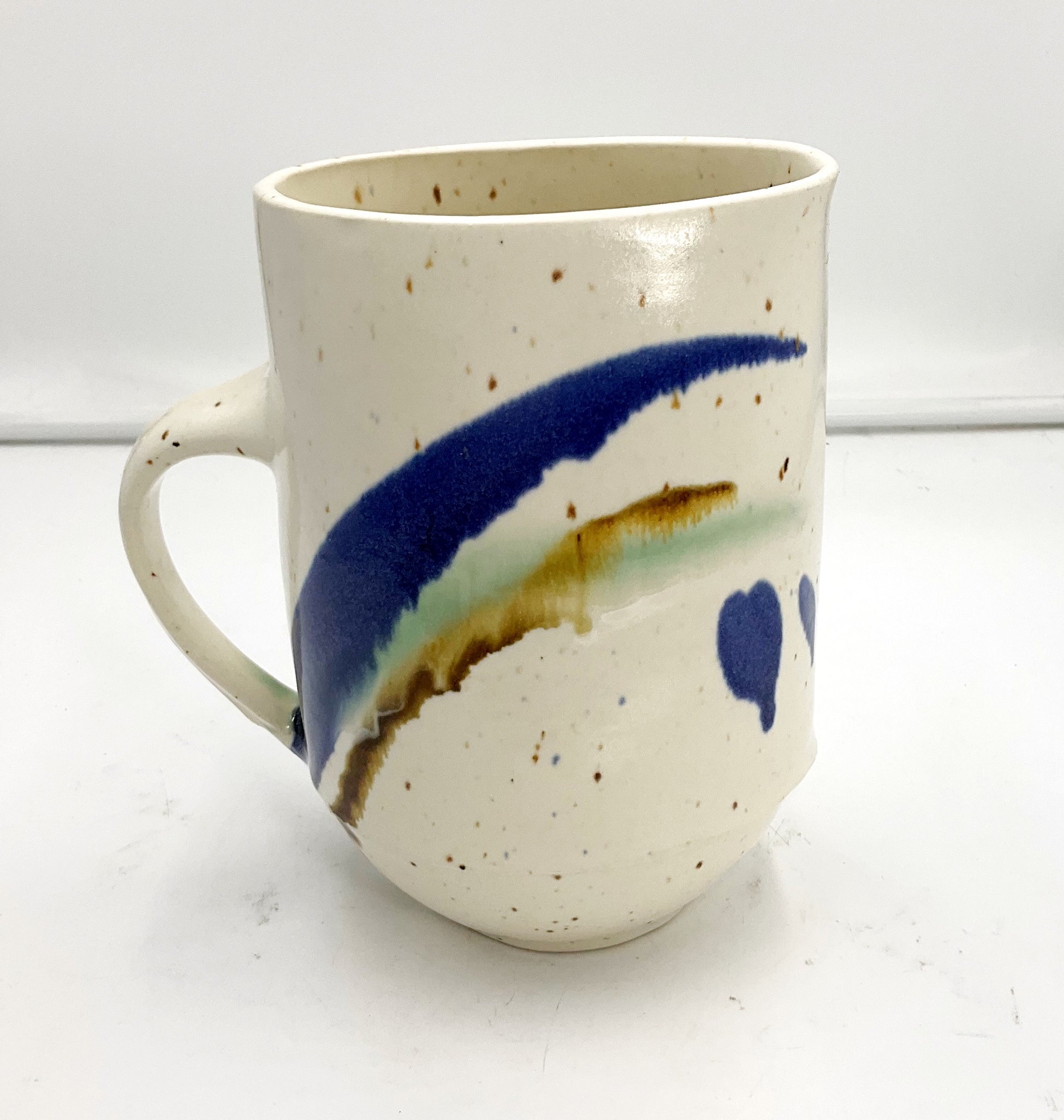 A hand made pottery pitcher with speckled base and caramel, aqua, blue swoops