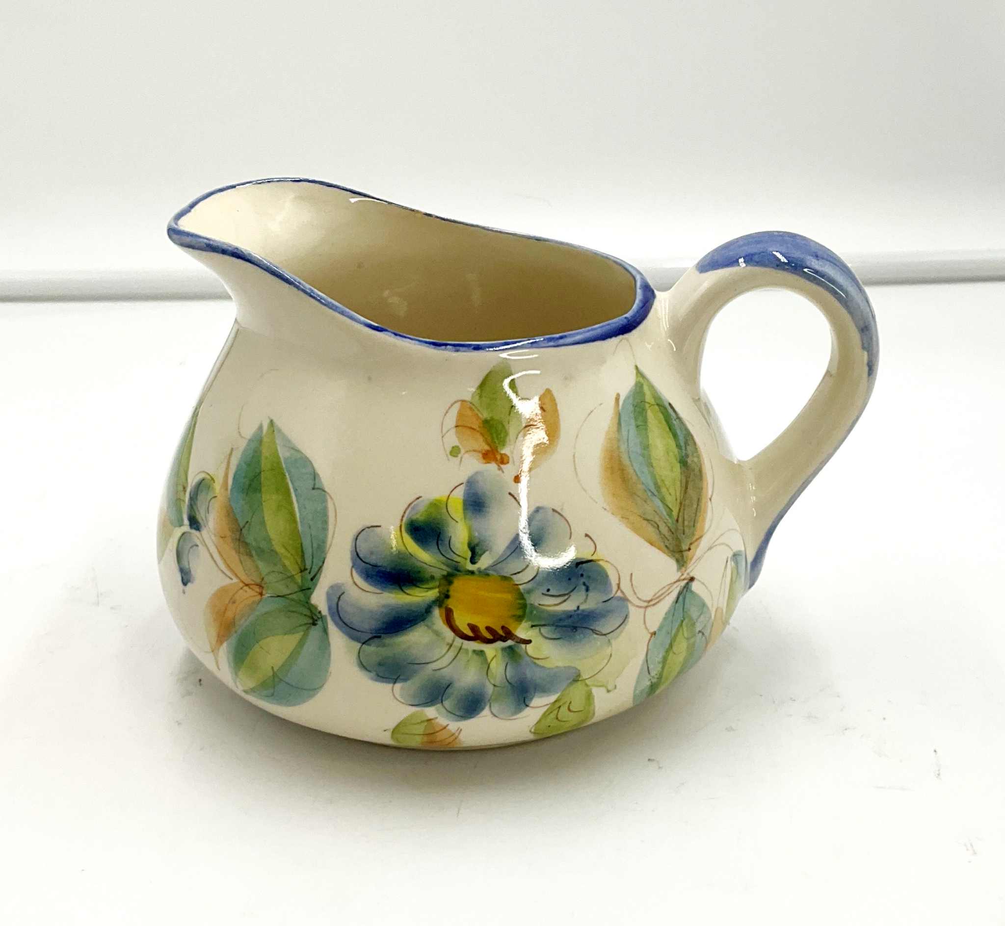 A hand painted squat pitcher by Secla, of Portugal,. Secla was an artistic pottery workshop established in Caldas da Rainha in 1947. Note the picture of the very small chip on the rim