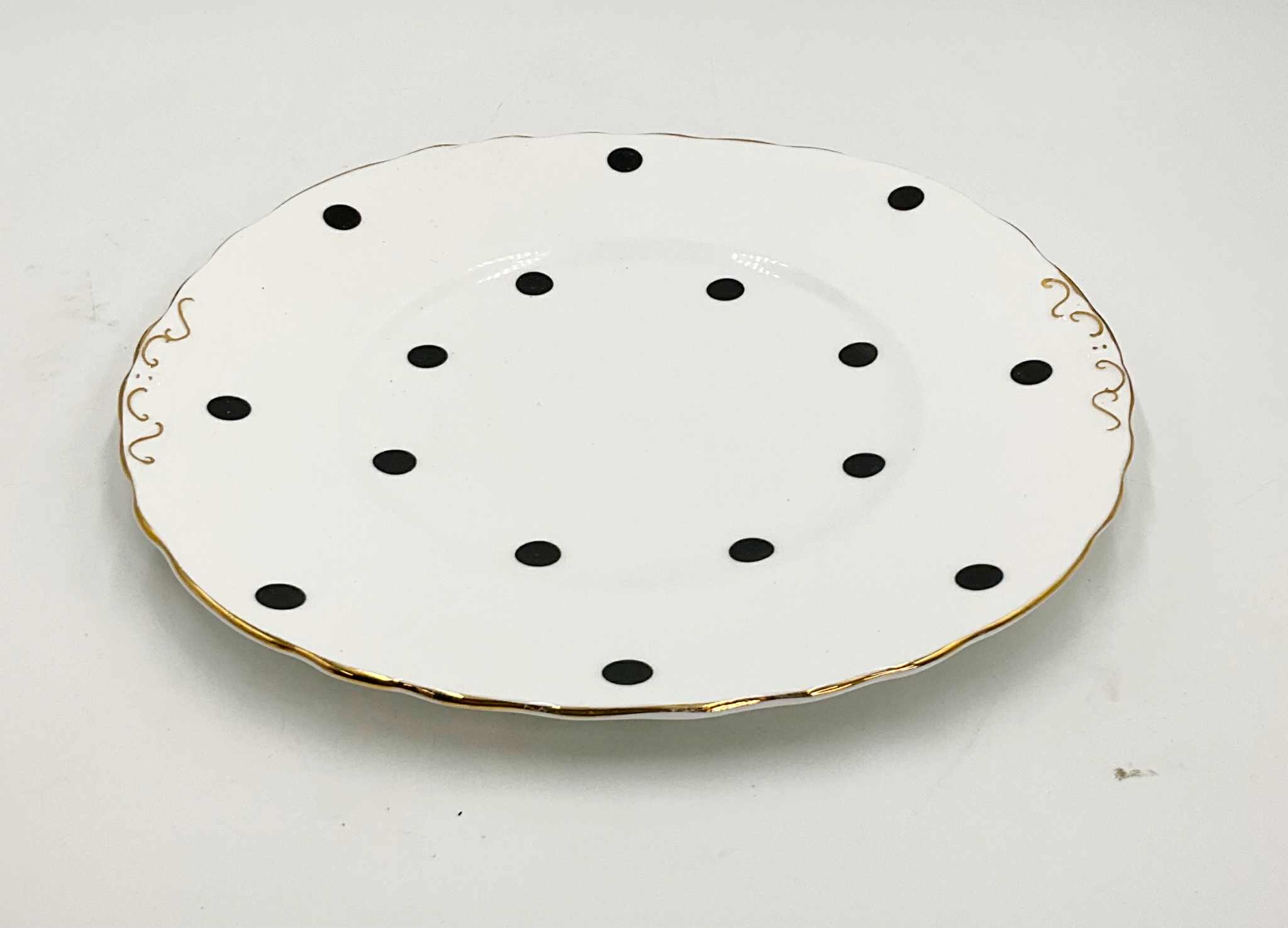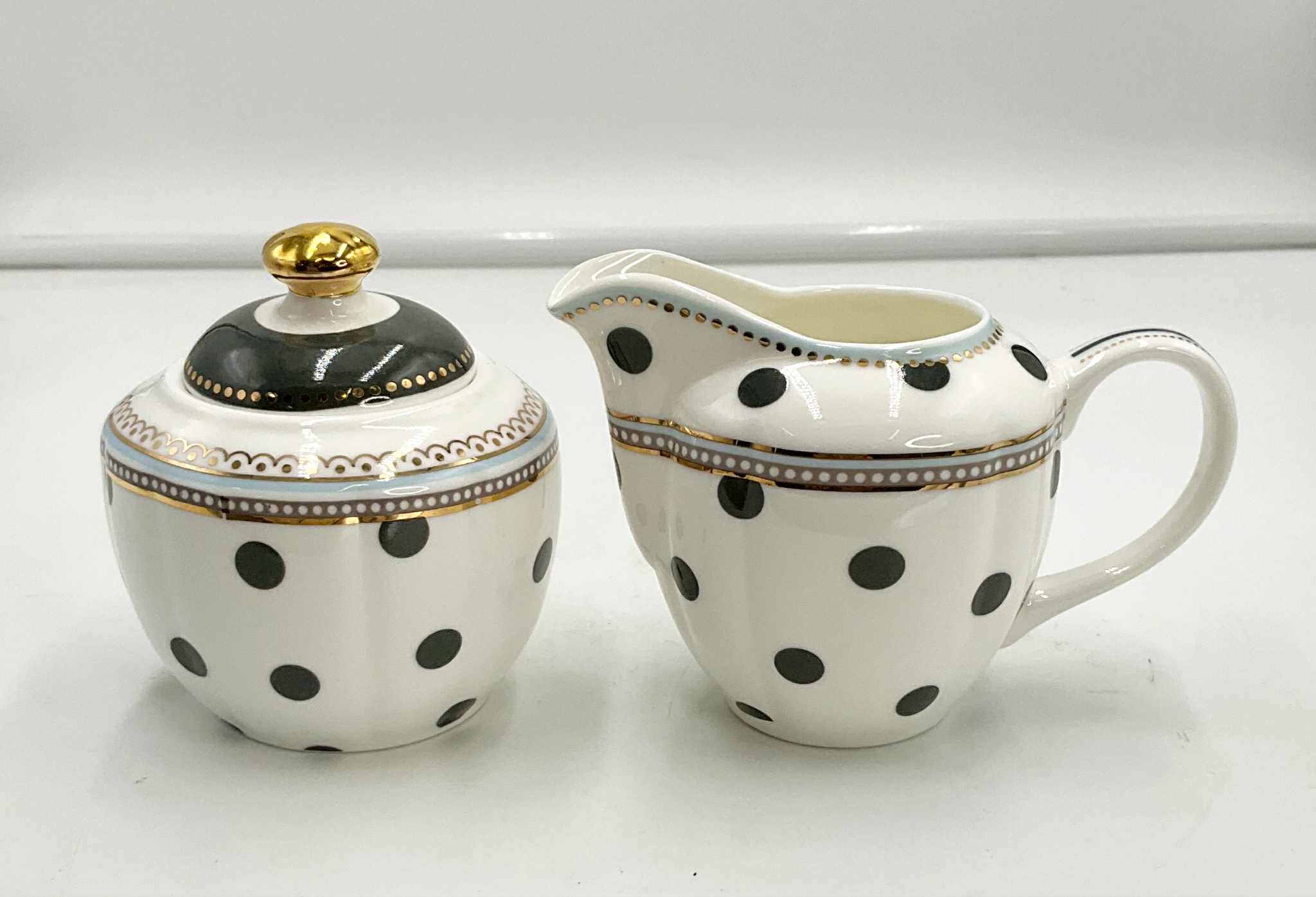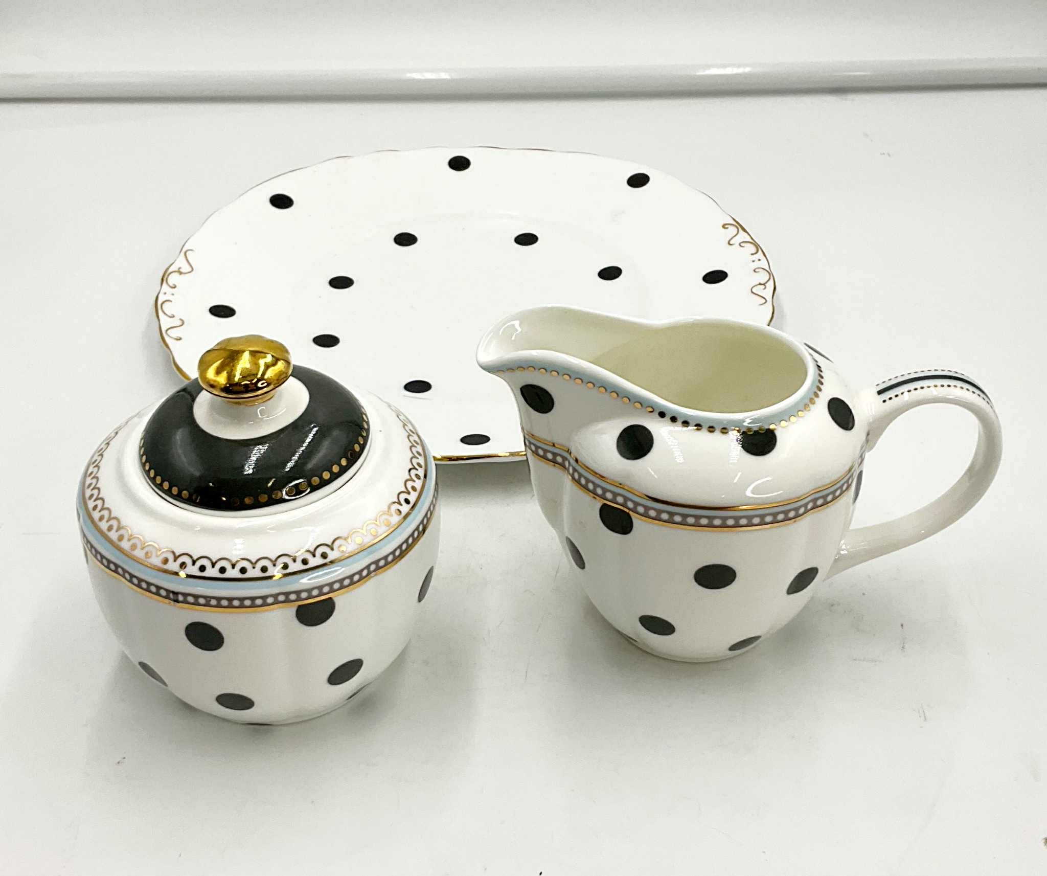 A cream and sugar set, along with the matching cookie tray from Graces Teaware, in a white base, grey polka dots and a gold and light blue trim