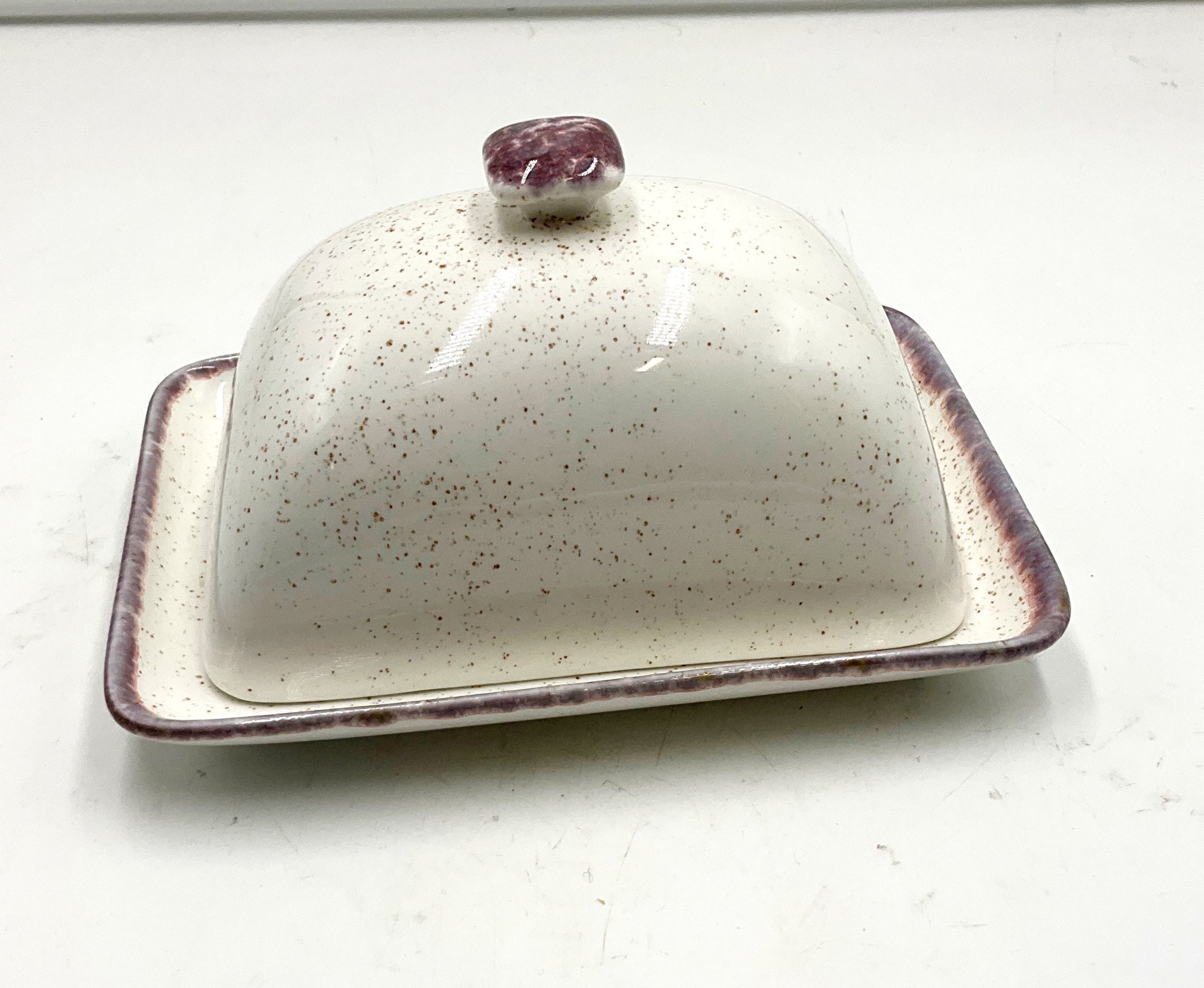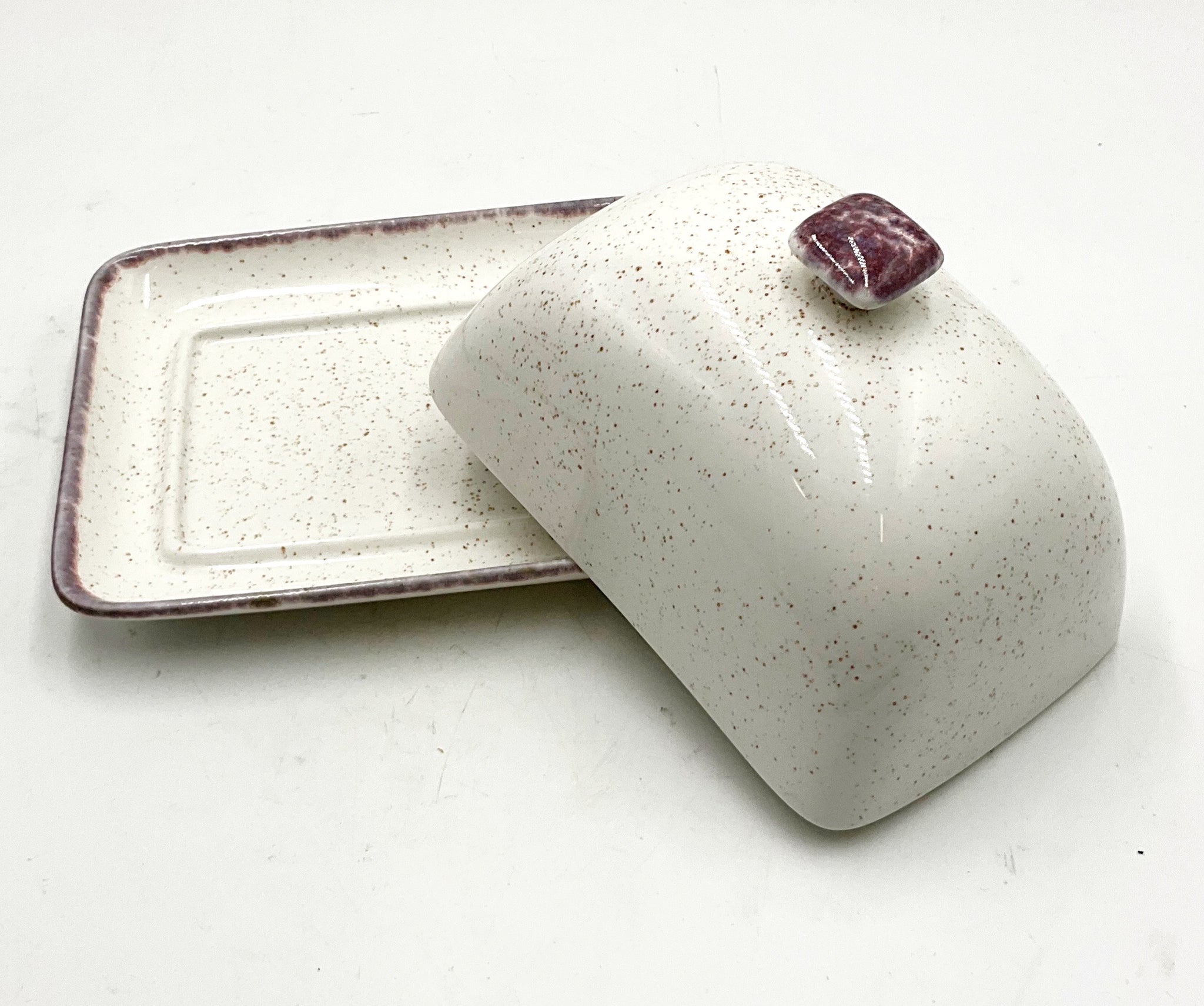 A mauve trimmed and speckled butter dish from Ollie &Olivia