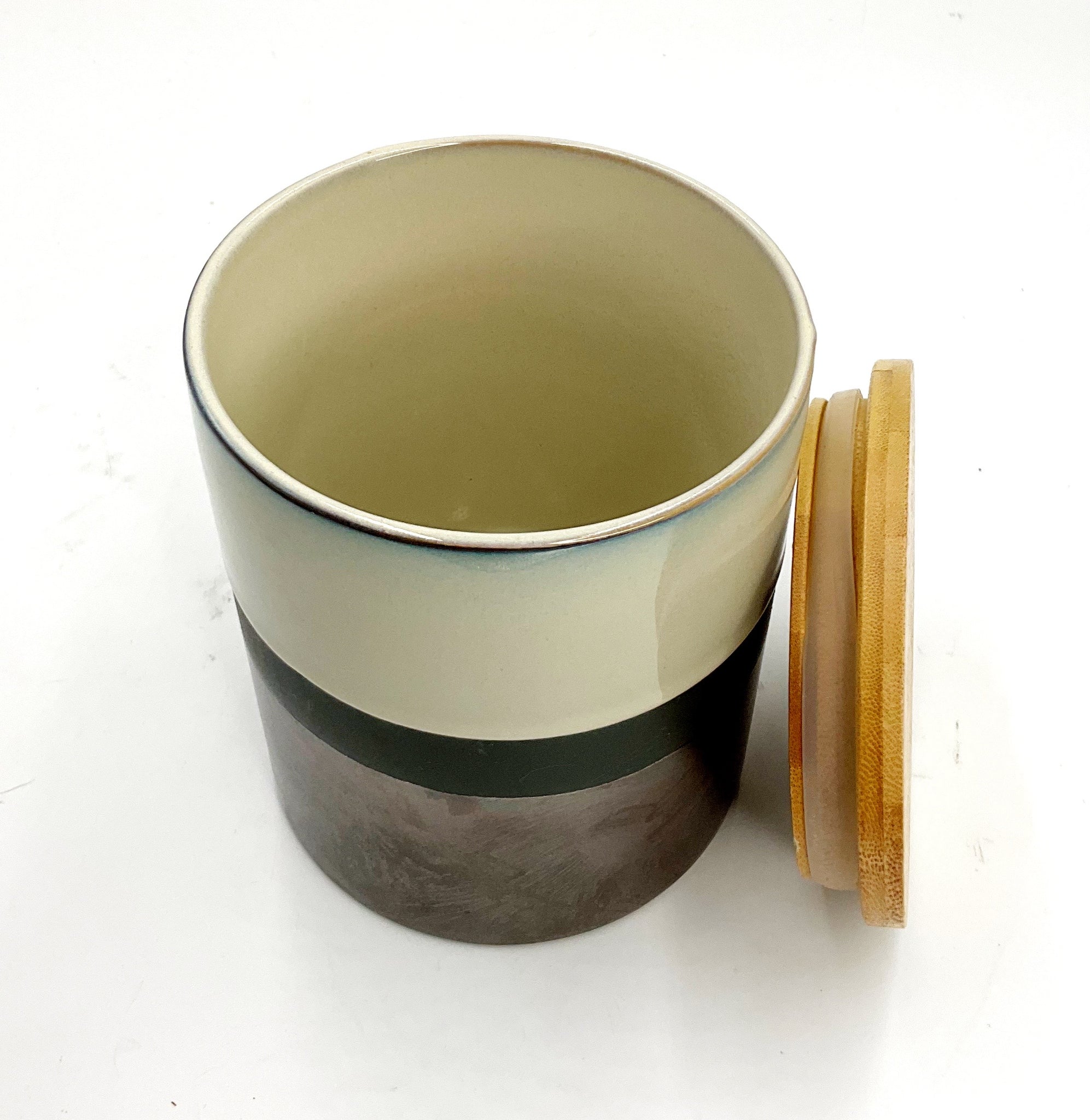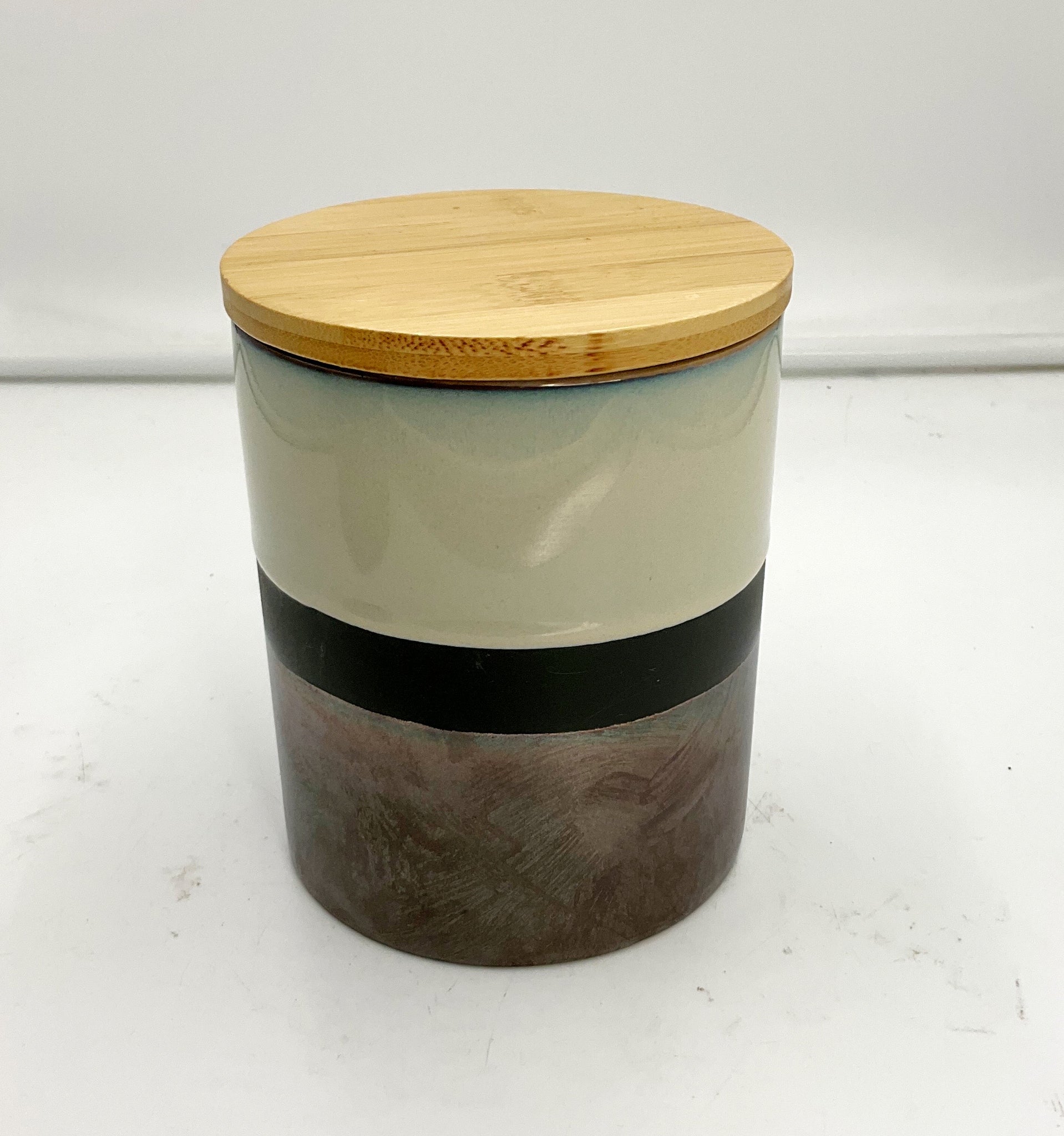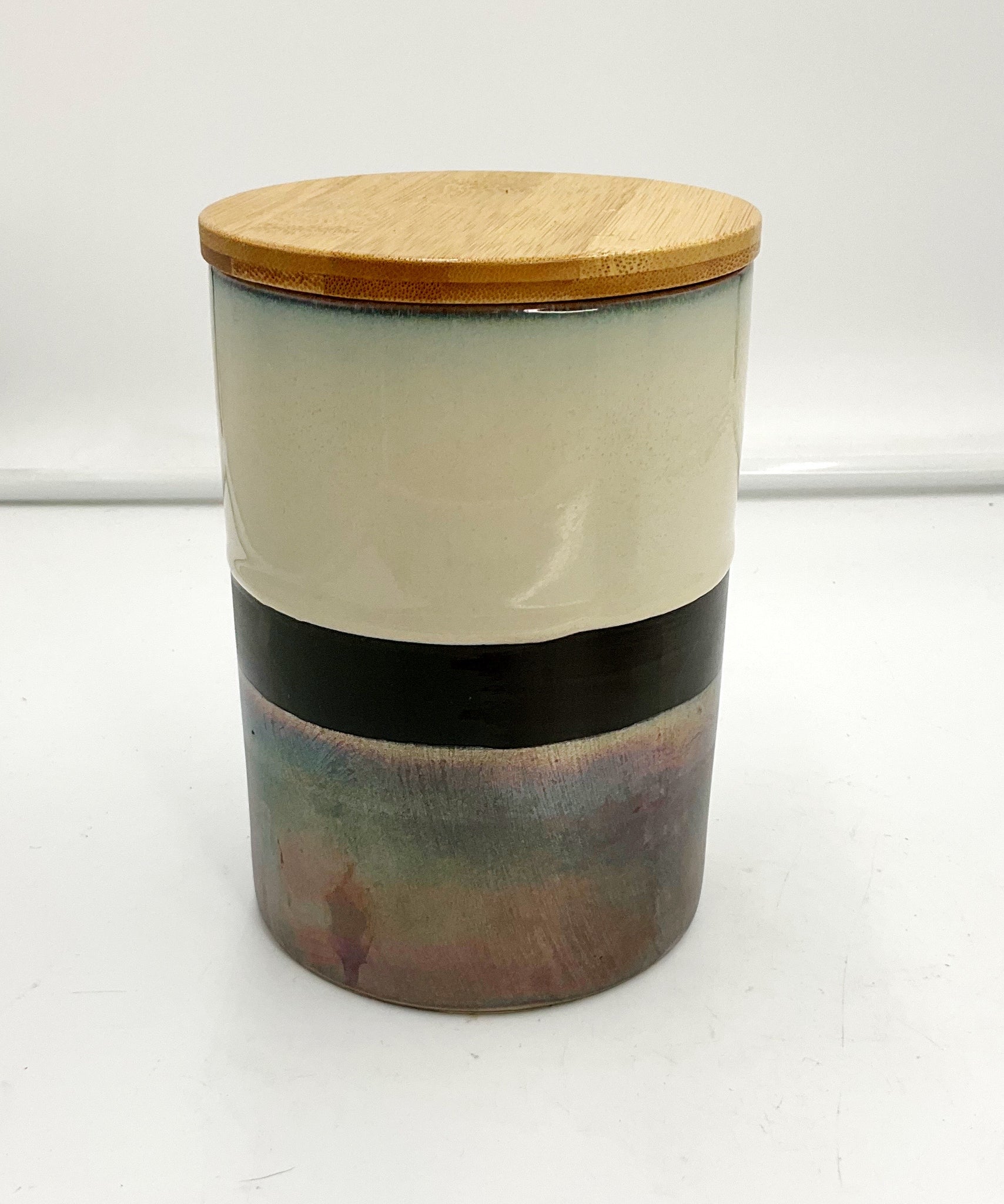 A metallic banded canister, with Bamboo lid from Natural Elements. Choose from two sizes. Made in China.