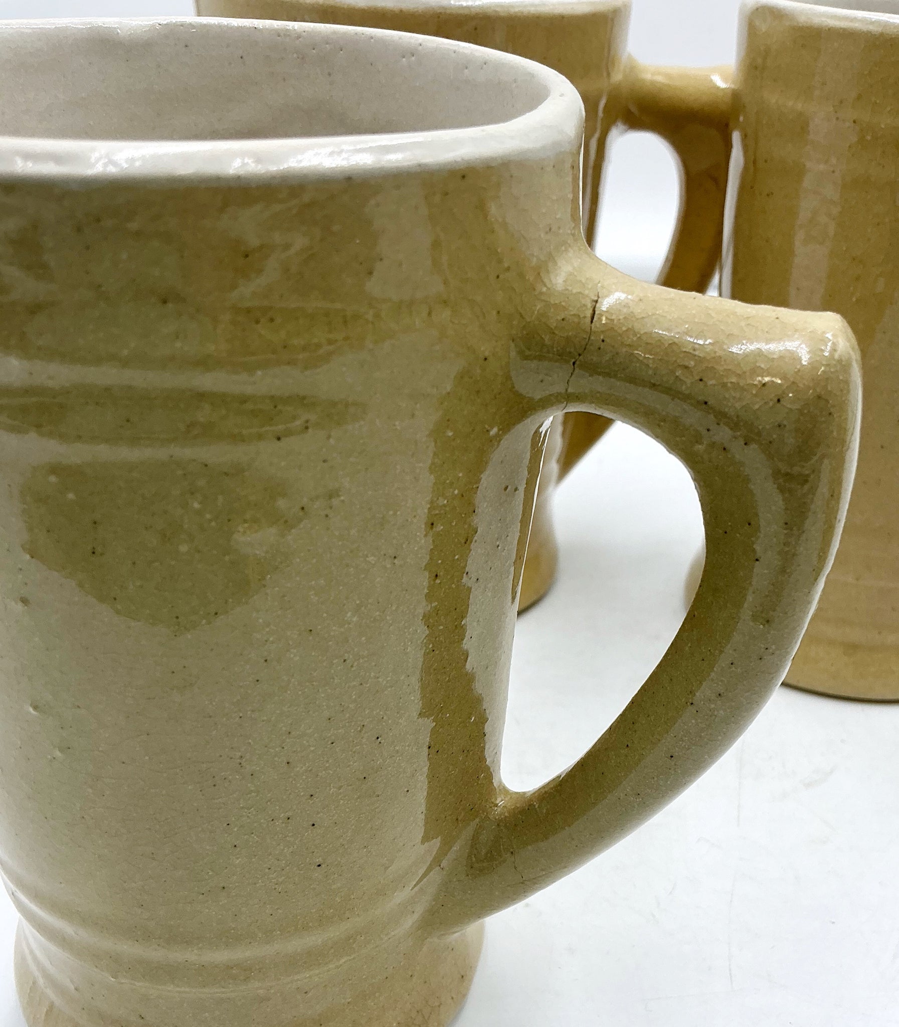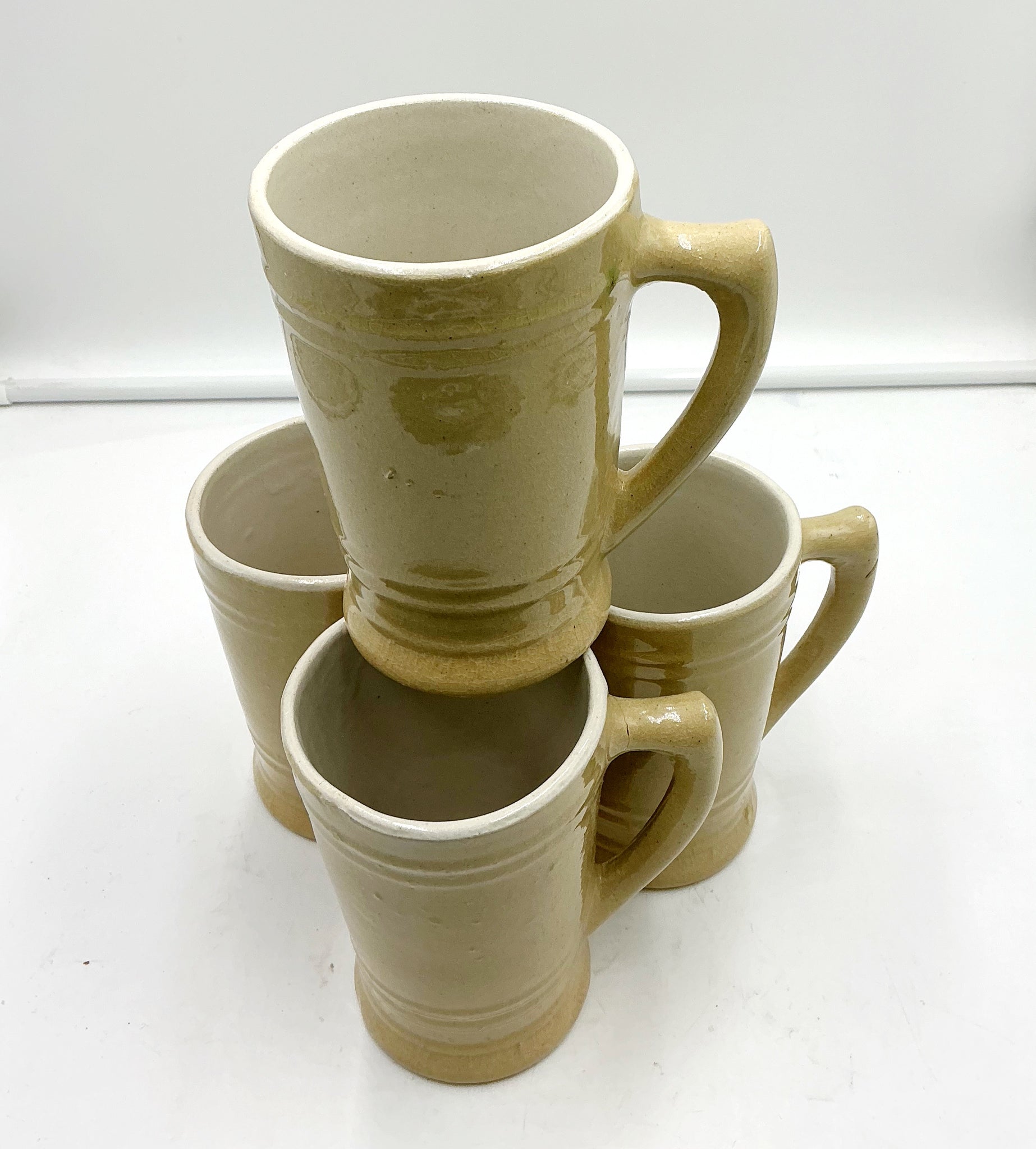 Solid stoneware beer steins, set of 4. Note the pic showing one with a crack in its handle
