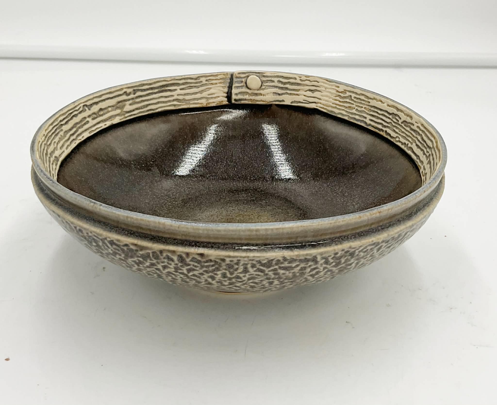 A lovely, unique pottery bowl, with rivet style rim, by Joanna Bird.