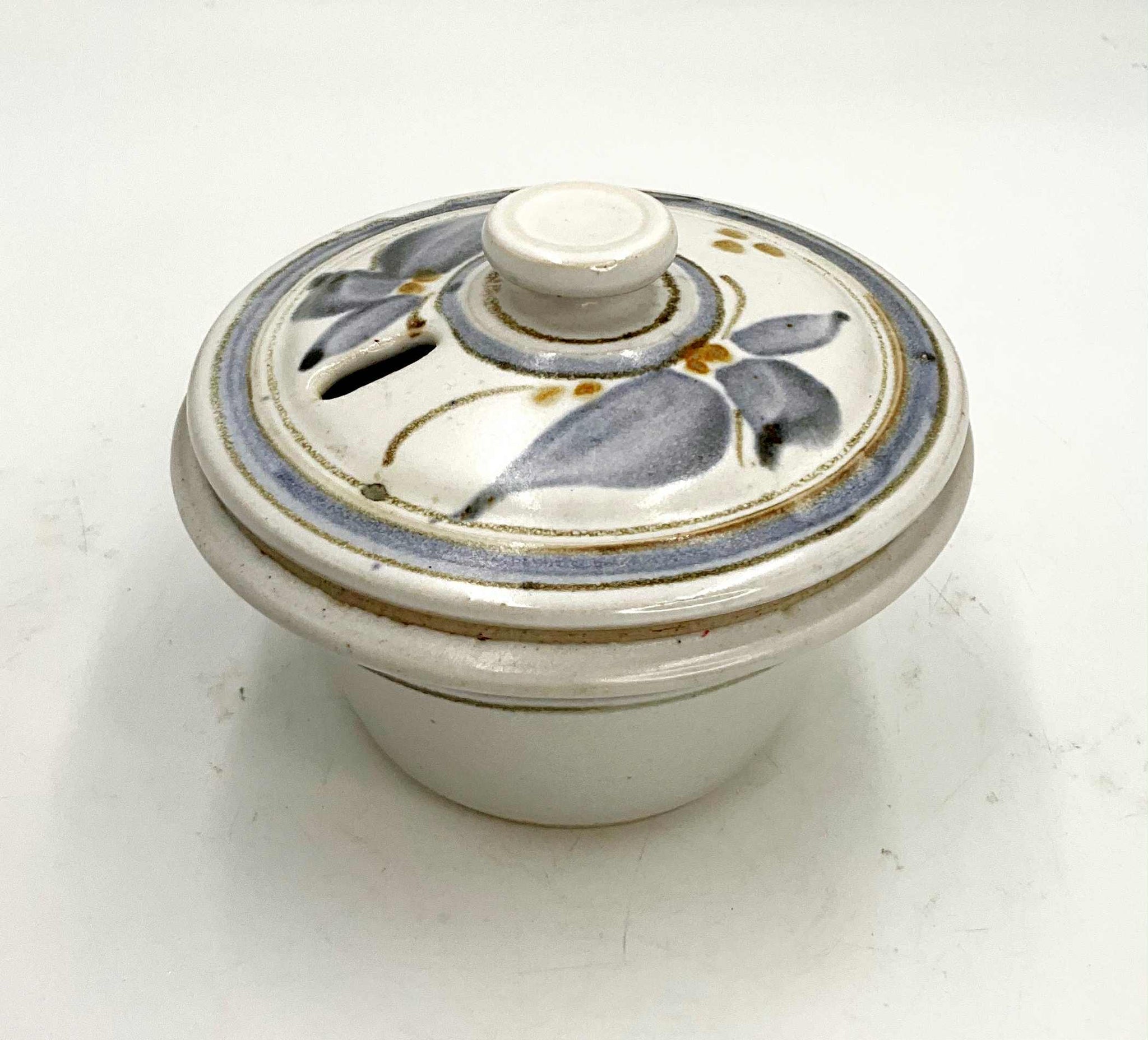 A small stoneware pot with fitted lid that has a vent hole. Glazed in soft colours