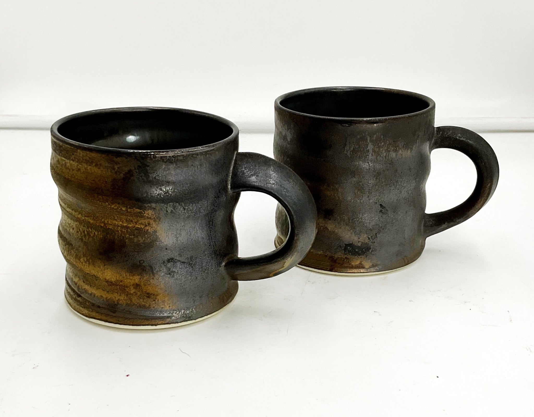 A pair of handmade, signed pottery mugs with a metallic glaze.
