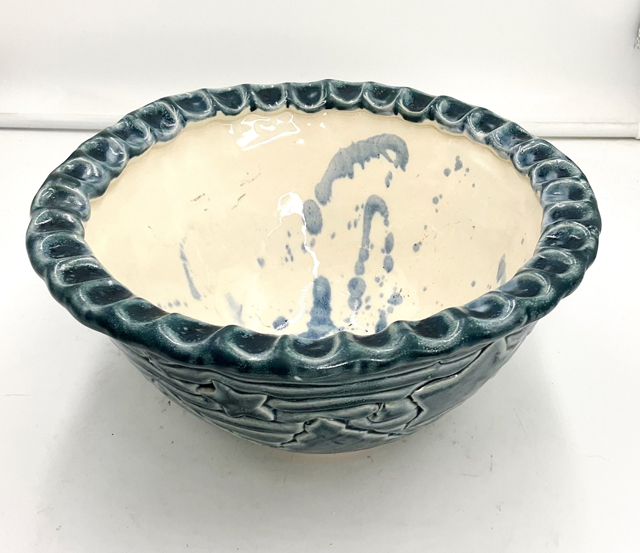 A coiled pottery fir tree and star bowl, with a blue glaze finish