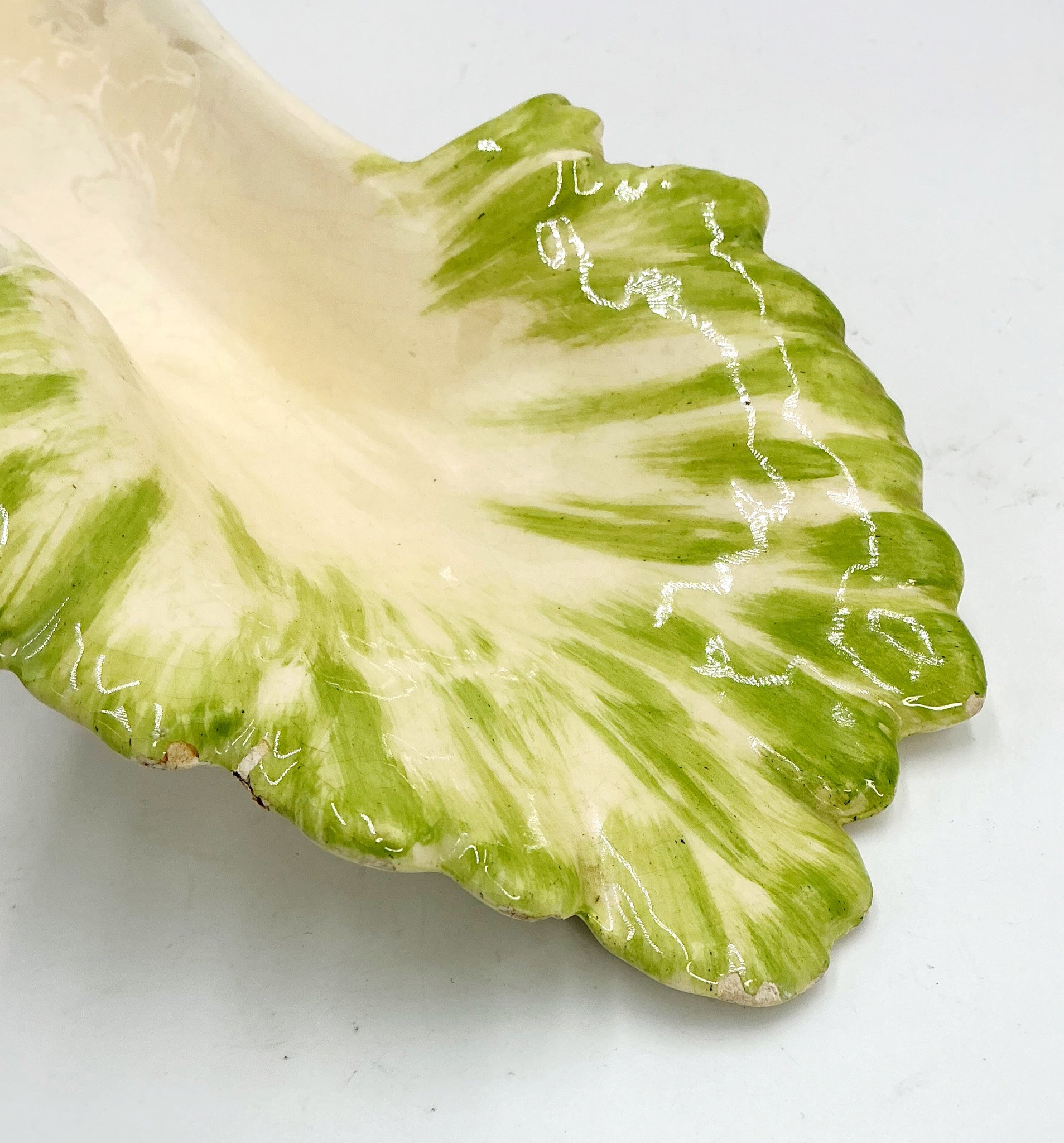 A ceramic tray in the shape of celery. Note some small glazing chips at leaves, a little crazing
