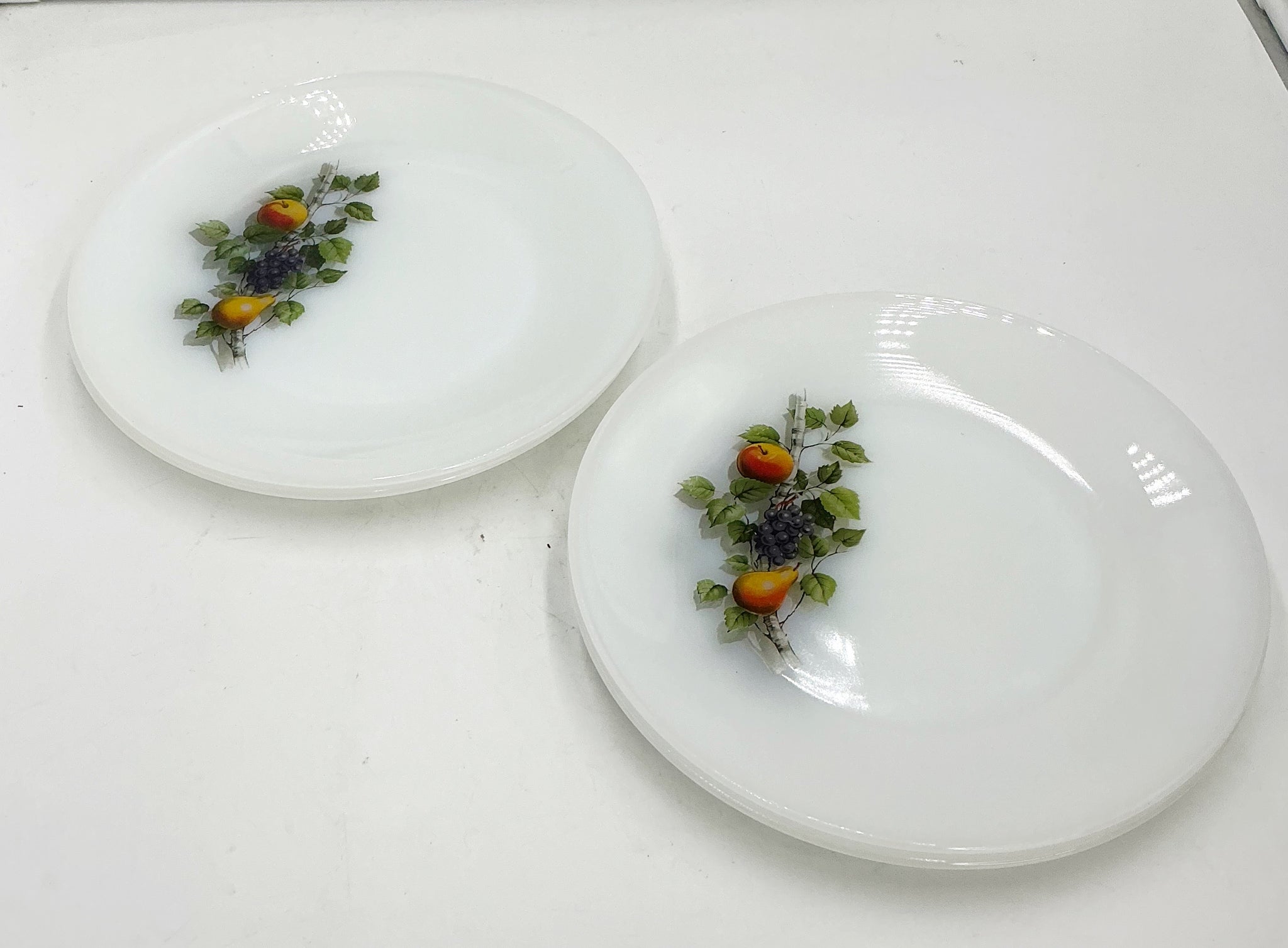 A set of four vintage Arcopal milk glass plates in the Fruits de France pattern