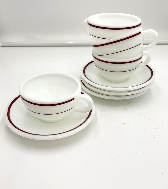 A set of four vintage Corning Pyrex restaurant ware cups and matching saucers… in white milk glass with burgundy striping. These are in perfect condition.