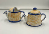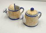 A cream and sugar set in basketweave pattern, in the shape of watering cans